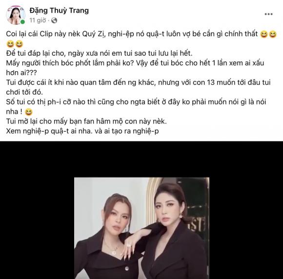 Dù bị hăm dọa nhưng có vẻ như Đăng Thùy Trang không hề sợ mà trái lại, cô còn vừa đăng đàn tuyên chiến luôn với Phương Lê. Cô không ngại ngần gọi đàn chị là con giáp thứ 13 và đòi bóc phốt xem ai xấu mặt hơn: "Coi lại cái clip này nè quý vị, nghiệp nó quật luôn vợ bé cần gì chính thất. Để tui đáp lại cho, ngày xưa nói em tui sao tui lưu lại hết. Mấy người thích bóc phốt lắm phải không? Vậy để tui bóc cho hết 1 lần xem ai xấu hơn ai? Tui được cái ít khi nào quan tâm đến người khác, nhưng với con 13 muốn tới đâu tui chơi tới đó. Số tui có thị phi cỡ nào thì cũng cho người ta biết ở đây không phải muốn nói gì là nói nha. Tui mở lại cho mấy bạn fan hâm mộ con này nè. Xem nghiệp quật ai nha và ai tạo ra nghiệp".