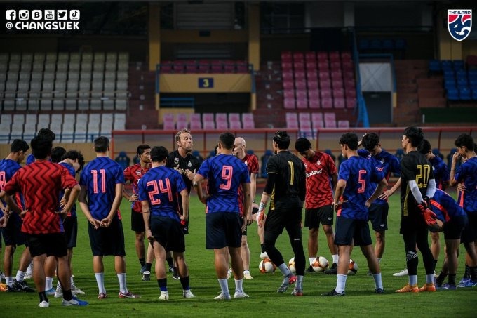 HLV Polking truyền đạt cho các cầu thủ Thái Lan trước buổi tập trên sân Hàng Đẫy, Hà Nội tối 21/5. Ảnh: Changsuek