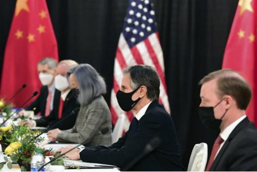 Ngoại trưởng Mỹ Antony Blinken trong cuộc gặp với các quan chức cấp cao Trung Quốc tại Alaska (Mỹ) tháng 3/2021. Ảnh: AP.
