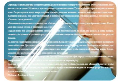 Sau khi nhận được giấy báo thanh toán tiền viện phí, người phụ nữ rất sợ mở tờ phiếu thanh toán, bởi vì bà tin chắc rằng cả đời bà cũng không đủ tiền để trả khoản phí này. Cuối cùng, khi bà cũng mở nó ra và nhìn thấy dòng ghi ở hàng trên cùng của tờ phiếu thanh toán: