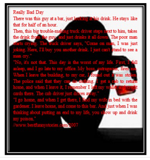 “Không, không phải vậy đâu ạ, mà là vì hôm nay là ngày tồi tệ nhất của đời tôi. Đầu tiên, tôi ngủ quên nên đến cơ quan bị muộn. Lão sếp của tôi tức giận đã sa thải tôi. Khi tôi rời cơ quan ra bãi đậu xe thì chiếc xe của tôi biến mất và cảnh sát thông báo vụ này thì chịu, bó tay thôi. Tôi đành đón taxi để về nhà; lúc xuống xe tôi mới biết mình để quên ví và thẻ tín dụng trên xe, rồi thấy thằng lái taxi rồ ga chạy mất hút”