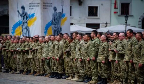 Quân đội Ukraine xếp hàng trước Ṭa thị chính ở Lviv, Ukraine ngày 18/6/2022. Ảnh Getty