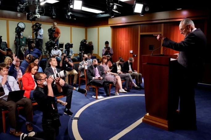 Lãnh đạo đa số Thượng viện Chuck Schumer giới thiệu dự luật 430 tỉ USD tại Điện Capitol. Ảnh: Reuters