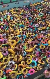 Hàng trăm du khách ôm phao bơi chen chúc đứng trong hồ bơi nhân tạo nằm trong công viên nước để vui chơi và giải nhiệt giữa trời nắng nóng.