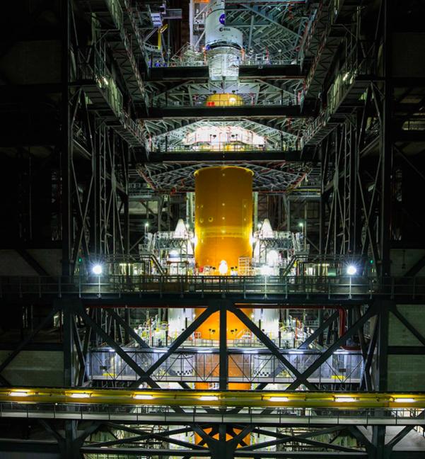 Siêu tên lửa SLS và tàu vũ trụ Orion (màu trắng) xếp chồng lên nhau trong Ṭa nhà lắp ráp phương tiện tại Trung tâm Vũ trụ Kennedy ở bang Florida, Mỹ. Ảnh: NASA