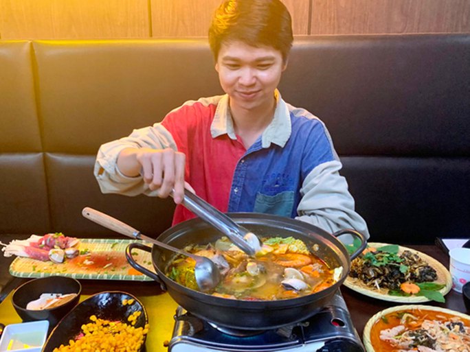Tiếp đến là ốc xào sả ớt, món ăn gắn liền với tuổi thơ của Duong. "Mỗi khi mực nước sông Mê Kông dâng cao, tôi cùng anh trai ra ngoài nhà bắt ốc và cho gà ăn một phần" - anh kể. Với món chính, Duong chọn lẩu cua đồng, ăn cùng nấm, cải thảo, đậu hũ, thịt bò, cá viên cùng nhiều loại hải sản khác như nghêu và tôm. Để món ăn thêm phần đậm đà, tất nhiên không thể thiếu nước mắm cay nồng để chấm.