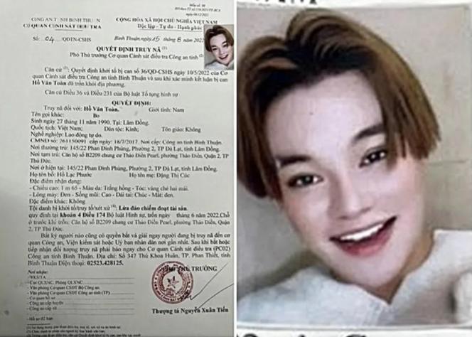 Trưa 15-8, PC02 Công an Bình Thuận đã ra quyết định truy nã Hồ Văn Toàn (32 tuổi, tên gọi khác là Bo, thường trú phường 2, TP Đà Lạt, Lâm Đồng; tạm trú chung cư Thảo Điền Pearl, phường Thảo Điền, TP Thủ Đức) đã bỏ trốn khỏi địa phương sau khi bị khởi tố về tội lừa đảo chiếm đoạt tài sản.