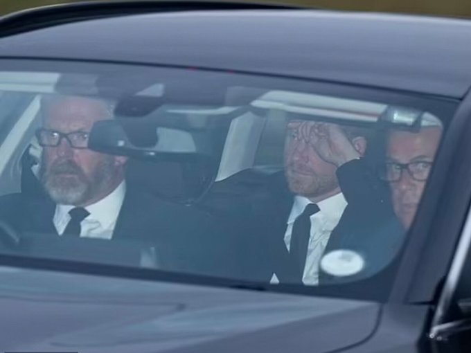 Harry được cho là đă đến lâu đài Balmoral lúc 19h52. H́nh ảnh do Daily Mail chia sẻ cho thấy anh ngồi trong ôtô di chuyển về lâu đài, mặc vest đen, cà vạt đen, tay chống lên đầu và gương mặt buồn rầu, thất thần.