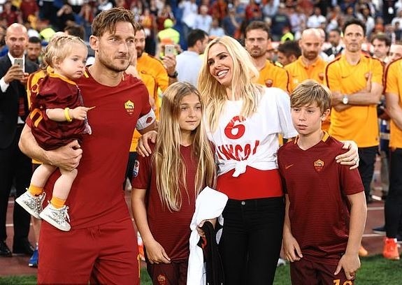 Totti, vợ cũ Blasi và ba con trong trận cuối sự nghiệp của anh ở Rome ngày 28/5/2017. Ảnh: TR