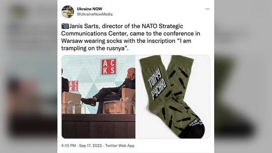 Quan chức NATO khoe tất 'chống Nga', Moscow nói gì? Janis Sarts, giám đốc Trung tâm Truyền thông Chiến lược của NATO ở Riga, đã bị phát hiện mang đôi tất có dòng chữ "Топчу русню" - "Tôi giẫm đạp lên Rusnya", một thuật ngữ xúc phạm người Nga - tại một hội nghị ở Warsaw hôm 16/9. Sarts xác nhận rằng ông đã thực sự mang chiếc tất đến hội nghị.