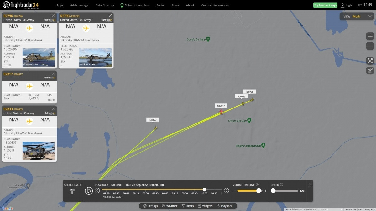 Các dịch vụ đặc biệt của Flightradar24 cho phép theo dơi t́nh h́nh trên không đă ghi lại khoảnh khắc 3 trực thăng UH-60 Black Hawk của Không quân Mỹ và 1 máy bay vận tải quân sự chưa xác định bay về phía biên giới Ukraine.