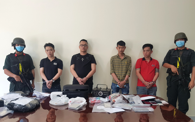 Nguyễn Hoàng Ân (thứ 3 từ trái sang) cùng đồng phạm, tang vật. Ảnh: Bảo Trân