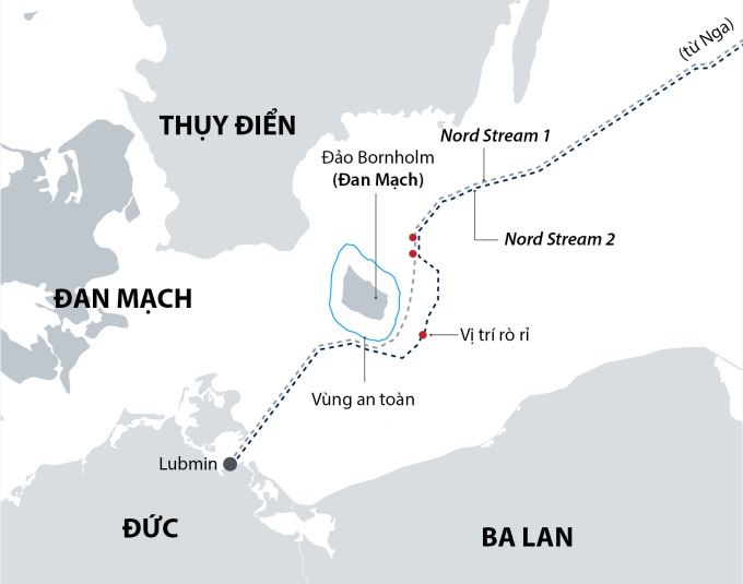 Vị trí ṛ rỉ trên đường ống Nord Stream 1 và Nord Stream 2. Đồ họa: DW.