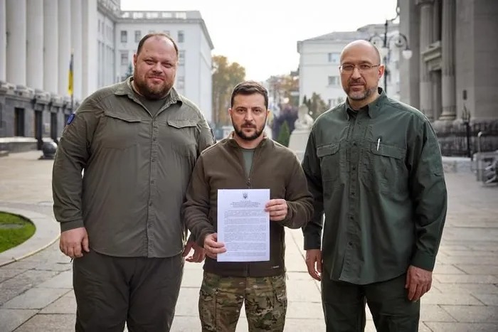 Ông Zelensky (giữa), Thủ tướng Ukraine Denys Shmyhal và Chủ tịch Quốc hội Ruslan Stefanchuk cầm đơn xin gia nhập NATO hôm 30/6. Ảnh: President.gov.ua