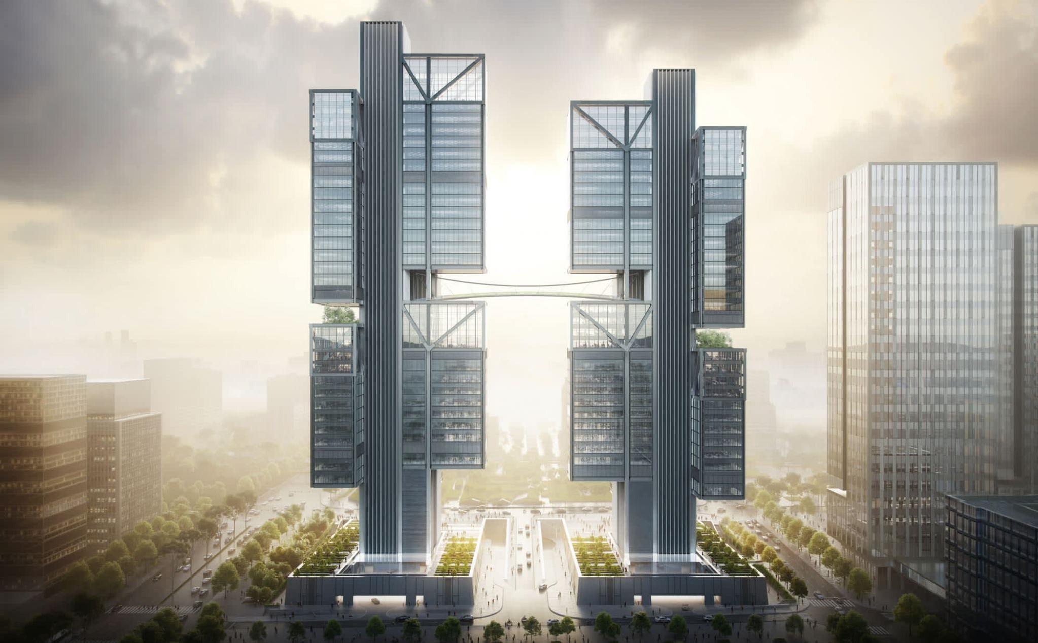Toà nhà của DJI có 2 toà tháp cao 200m, 1 toà có 40 tầng và toà còn lại có 44 tầng, 2 toà tháp này được nối nhau bằng 1 cây cầu ở độ cao 90m.