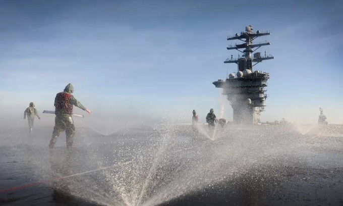 Thủy thủ tẩy rửa mặt boong tàu USS Nimitz. Ảnh: US Navy.