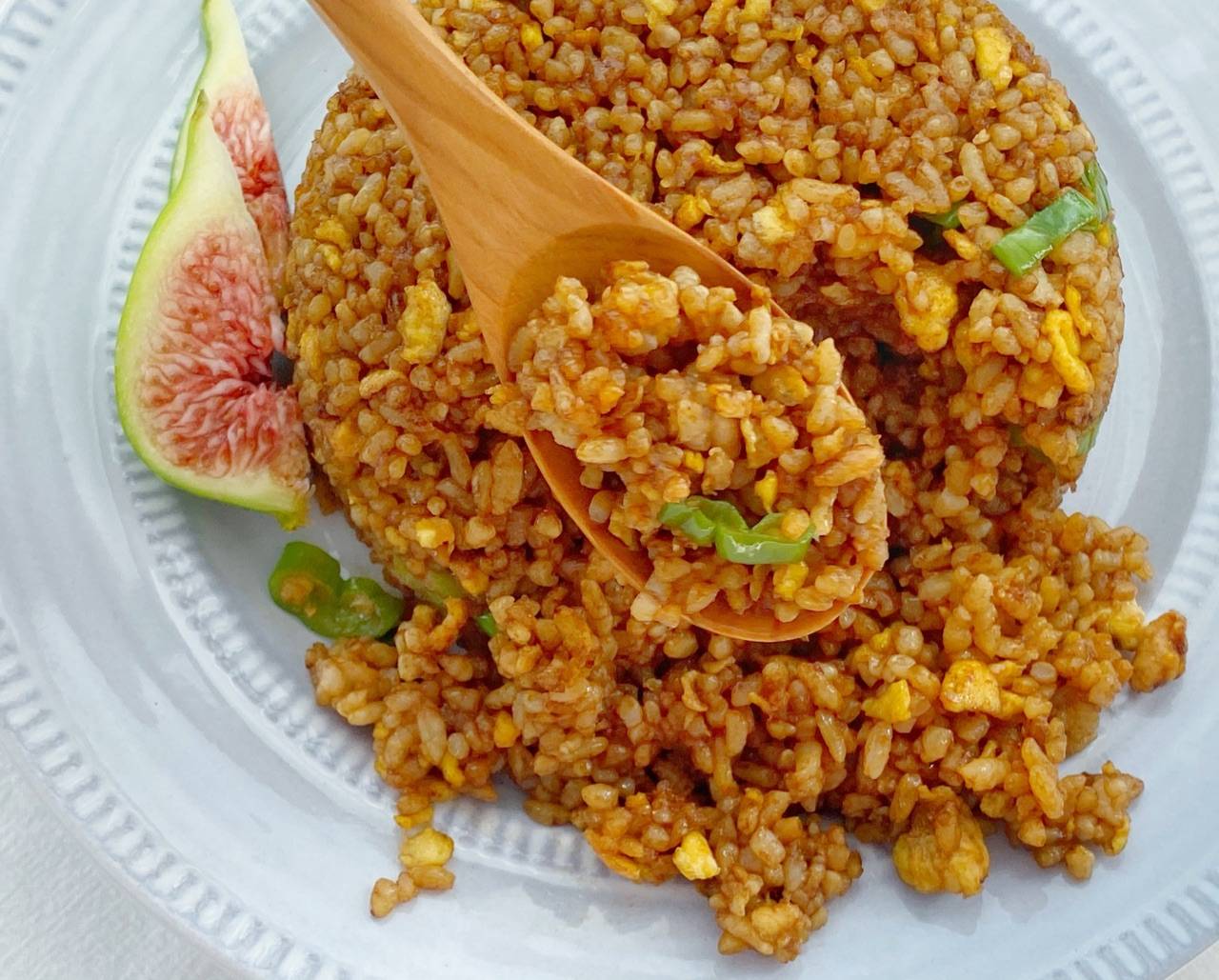Thành phần: Cơm, trứng, hành lá cắt nhỏ, nước tương nhạt, nước tương đậm, dầu thực vật.