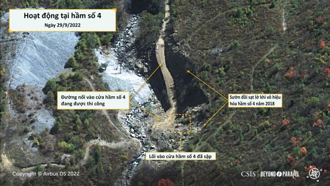 Beyond Parallel, dự án được tài trợ bởi Trung tâm Nghiên cứu Chiến lược và Quốc tế (CSIS) ở Mỹ, hôm qua công bố ảnh vệ tinh chụp ngày 29/9, cho thấy khu vực trước hầm số 4 ở băi thử hạt nhân Punggye-ri của Triều Tiên dường như đă được dọn dẹp. "Hoạt động làm đường đến hầm số 4 được nối lại. Con đường đó nối vào một cửa hầm đă sập", các chuyên gia của dự án cho biết.