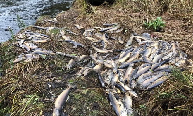Một nhà sinh vật học Canada ước tính có 65.000 con cá hồi chết ở con lạch khô hạn, trong đó hơn 70% không thể đẻ trứng.