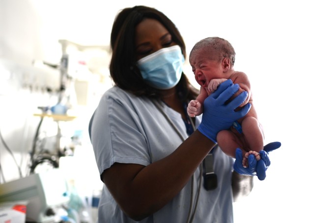 Y tá đỡ em bé sơ sinh trong bệnh viện ở Paris ngày 29/6. Ảnh: AFP.