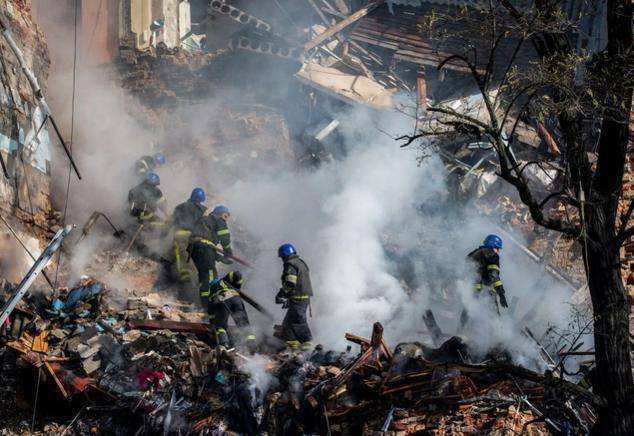 Lính cứu hỏa Ukraine nỗ lực giải cứu người bị mắc kẹt trong đống đổ nát sau vụ tập kích đường không của Nga vào thủ đô Kiev hôm 17/10 (Ảnh: Getty).
