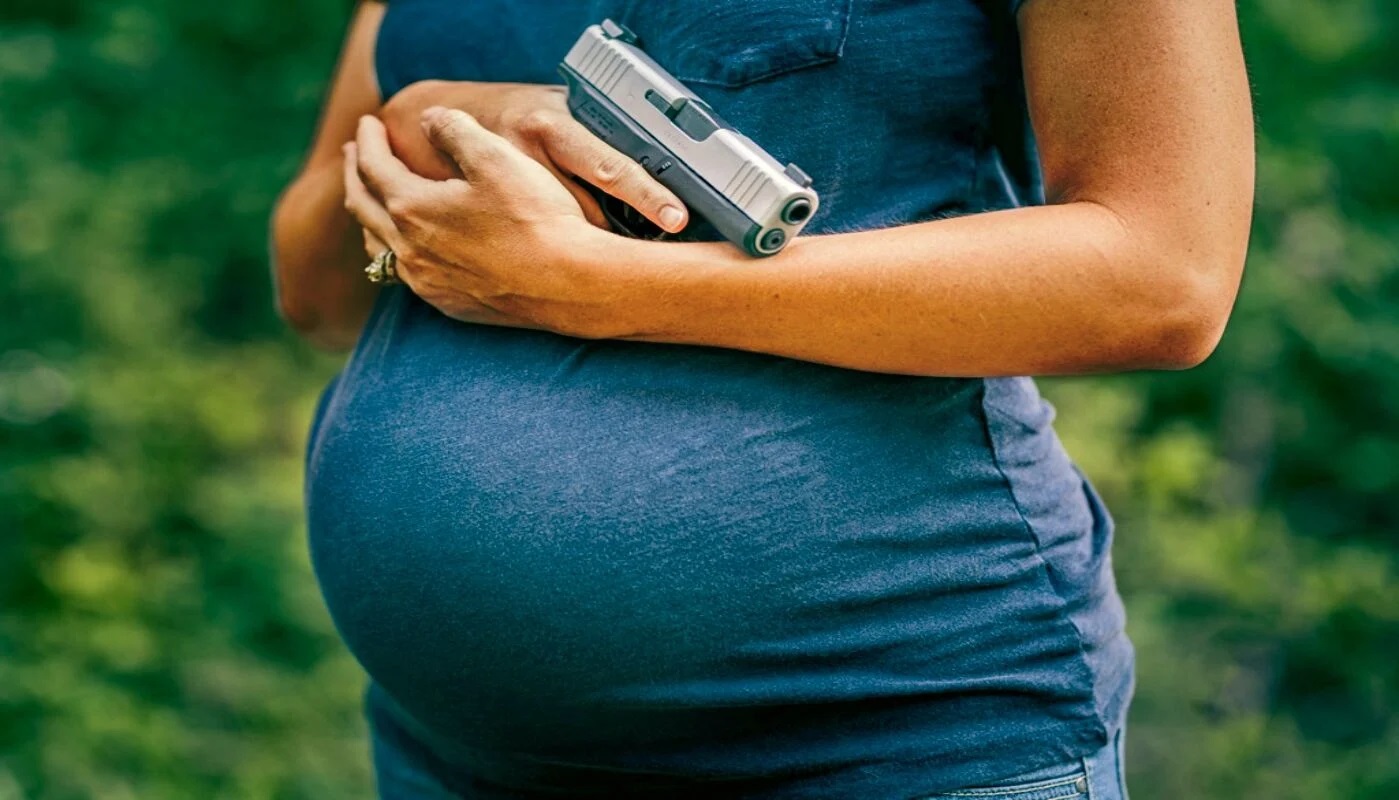 Người phụ nữ mang bầu cầm súng tiếp cận sĩ quan cảnh sát. (Ảnh minh họa: Ammo to Go)