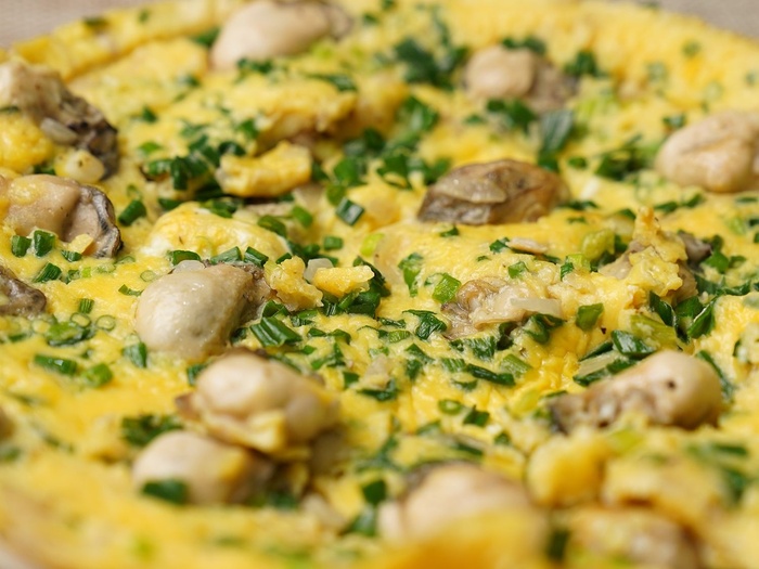 Trứng đánh tan. Khi hàu chín thì cho trứng đã đánh vào và tráng đều chảo. Sau đó đậy nắp lại, để lửa vừa cho trứng chín. Mách nhỏ: Đậy nắp giúp trứng chín đều 2 mặt và không cần phải lật khiến trứng bị vỡ.