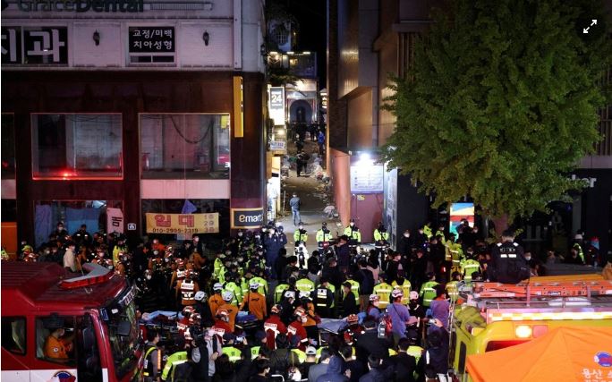 Lực lượng cứu hỏa tại hiện trường nơi ít nhất 149 người chết trong vụ giấm đạp tại lễ hội Halloween ở Seoul, Hàn Quốc. Ảnh: Reuters.