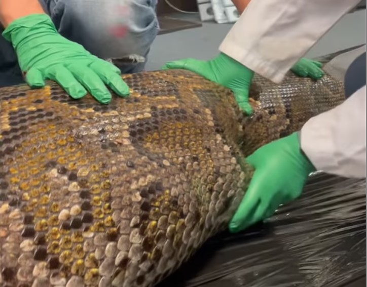 Theo như một nhóm nhà khoa học quyết định rạch bụng con trăn khổng lồ 5,4 mét để xem bên trong có gì. Kết quả khiến họ bị sốc, sau khi nhận điện báo về việc bắt được con trăn Miến Điện khổng lồ có phần bụng phình to ra bất thường.