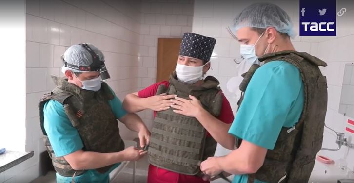 Bác sĩ mặc áo giáp gắp đạn nổ khỏi ngực binh sĩ Nga. Bộ Quốc phòng Nga hôm 10/11 công bố video nhóm bác sĩ thuộc Viện Lâm sàng Trung ương Quân đội (TsVKG) tiến hành ca phẫu thuật cứu sống binh sĩ bị thương nặng khi tham gia chiến dịch quân sự tại Ukraine.