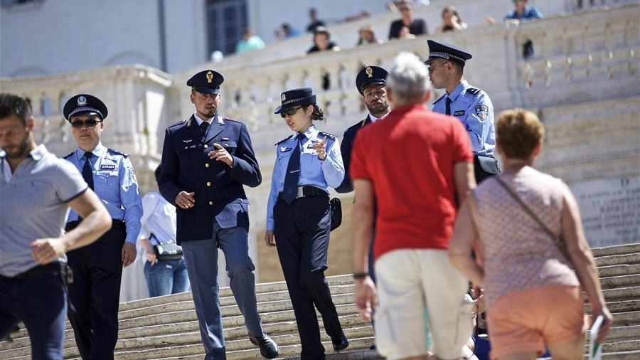 Cảnh sát Trung Quốc tuần tra chung cùng cảnh sát Italy trong kế hoạch kéo dài 20 ngày vào năm 2018. Ảnh: CGTN.