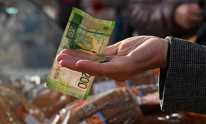 Một khách hàng thanh toán bằng tiền giấy và xu cho người bán hàng ở chợ tại Omsk, tây nam Siberia, Nga hồi tháng 10. Ảnh: Reuters.