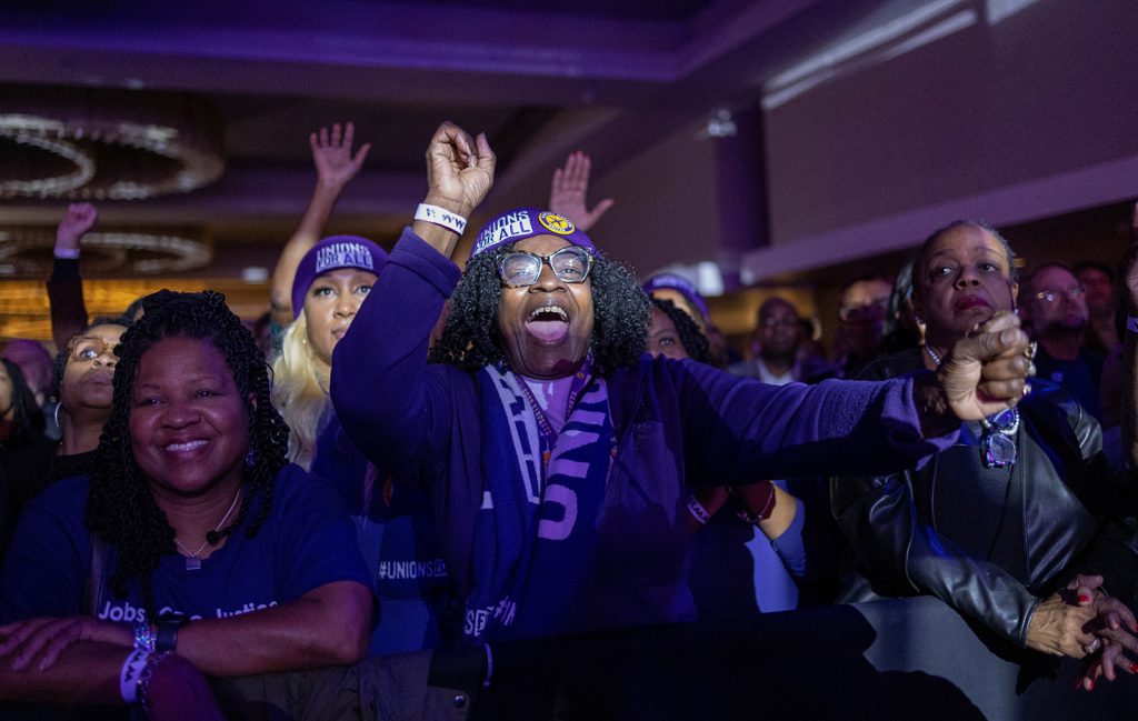 Supporters of U.S. Senator Raphael Warnock (D-GA) react during an election night party after polls closed for the U.S. midterm runoff elections between Warnock and his Republican challenger Herschel Walker in Atlanta, Georgia, U.S., December 6, 2022. REUTERS/Carlos Barria