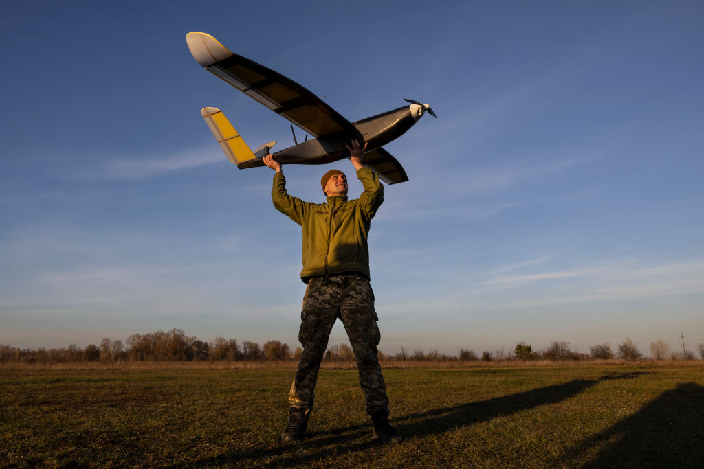 Binh sĩ Ukraine thực tập sử dụng UAV để phát hiện ḿn bẫy và các vật thể nhỏ được ngụy trang trên mặt đất tại một căn cứ ở miền Trung Ukraine. (Ảnh: Yulii Zozulia/ Ukrinform/Future Publishing via Getty Images)