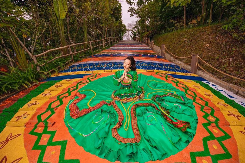 "Tôi ấn tượng với con đường thổ cẩm dài 1.700 m trên đồi dẫn lên khu nghỉ dưỡng, các họa tiết mang đặc trưng vùng cao do người địa phương vẽ tay toàn bộ. Theo nhân viên resort giới thiệu, công tŕnh này hoàn thành hai năm trước, đạt kỷ lục Guinness", Nhung cho hay.