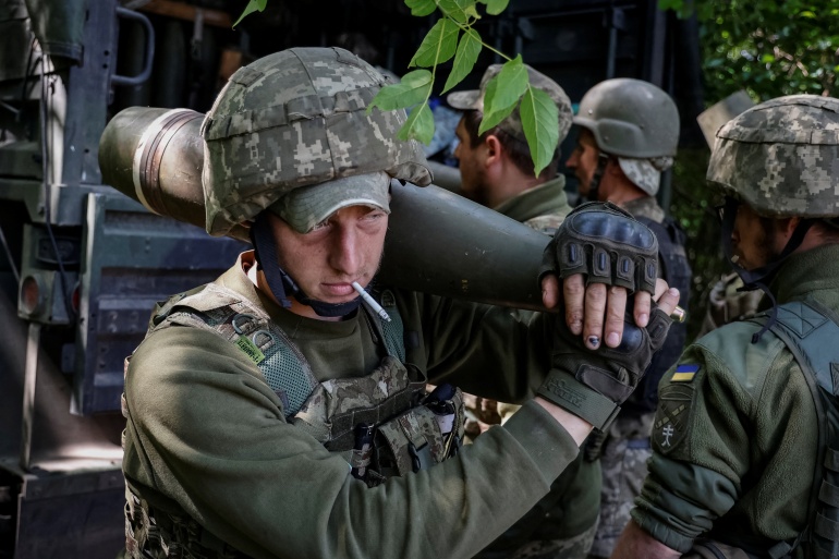 Binh sĩ Ukraine đang vận chuyển vũ khí. Ảnh IT