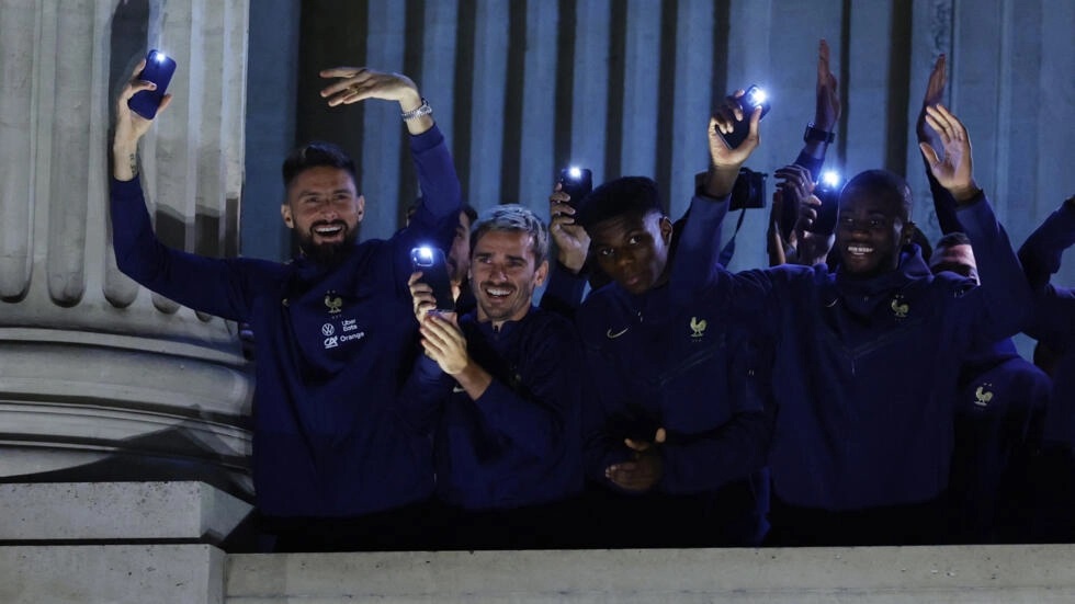 Các cầu thủ và huấn luyện viên Didier Deschamps xuất hiện trên ban công của khách sạn Crillon lúc 21 giờ 40, giờ Paris. Dưới quảng trường, hàng nghìn người hâm mộ tay vẫy cờ hoặc giương các biểu ngữ «*Merci les Bleus*– Cảm ơn đội quân áo Lam*». Các cầu thủ tươi cười vẫy chào người hâm mộ, duy chỉ có Kylian Mbappé trong nét mặt buồn, thẫn thờ vẫy chào miễn cưỡng, trong khi dưới quảng trường mọi người đồng thanh gọi tên anh.