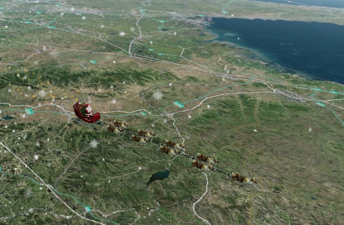 H́nh ảnh giả lập Ông già Noel di chuyển qua Trung Quốc vào đêm Giáng sinh 24/12 trên bản đồ trực tuyến 3D của NORAD. Ảnh chụp màn h́nh.