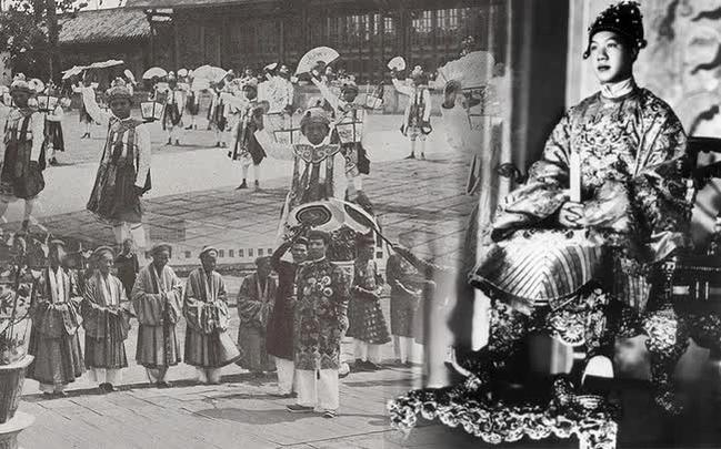 Thân công đứng hàng bên trong cùng điện, quan văn vơ từ tam phẩm đứng hai hàng trên sân rồng theo cấp bậc, tầng sân dưới dành cho các bô lăo. Xa bên ngoài là binh lính, voi ngựa. Trước khi nhạc tấu, 9 phát súng được lệnh nổ, bá quan văn vơ, đọc biểu mừng nhà vua của bách quan và các địa phương.