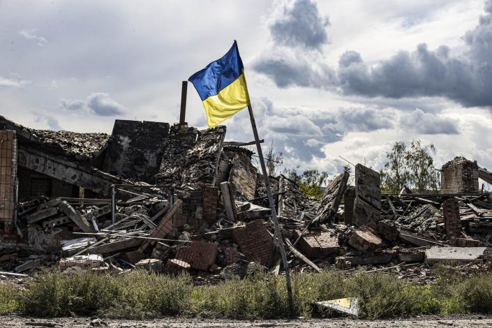 Một lá cờ Ukraine treo tại làng Dolyna ở Donetsk Oblast, Ukraine sau khi quân đội Nga rút đi vào ngày 24 tháng 9 năm 2022. Ảnh Getty