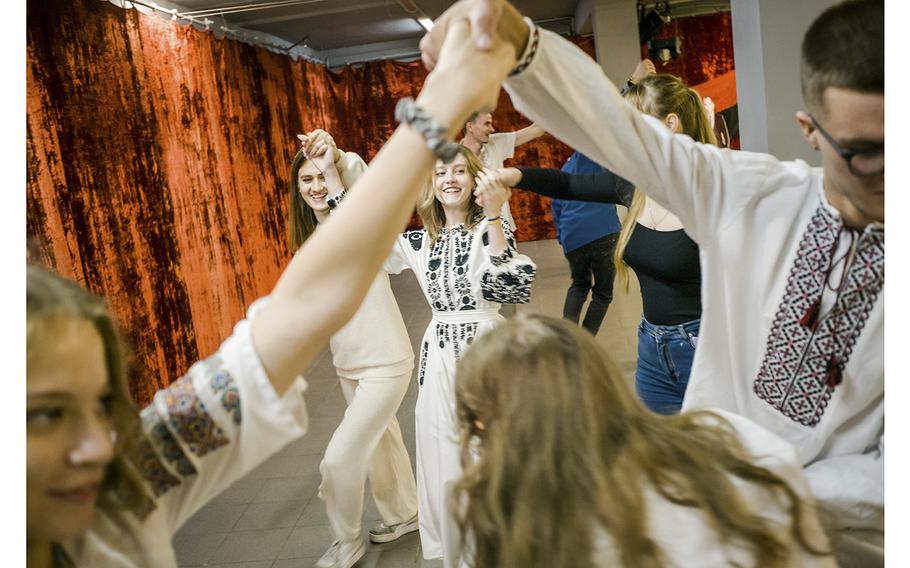 Các sinh viên trong trang phục truyền thống Ukraine trong đêm khiêu vũ hiếm hoi ở Kiev giữa thời chiến. Ảnh: Washington Post