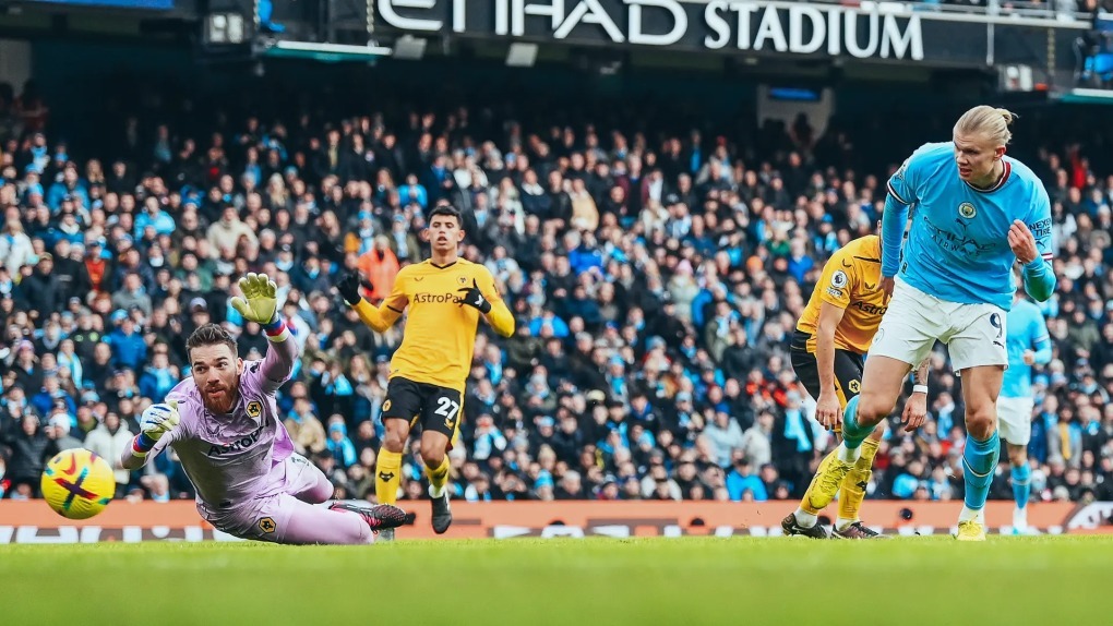 Haaland ghi bàn ấn định tỷ số 3-0 trước Wolves ở vòng 21 Ngoại hạng Anh ngày 22/1. Ảnh: mancity.com