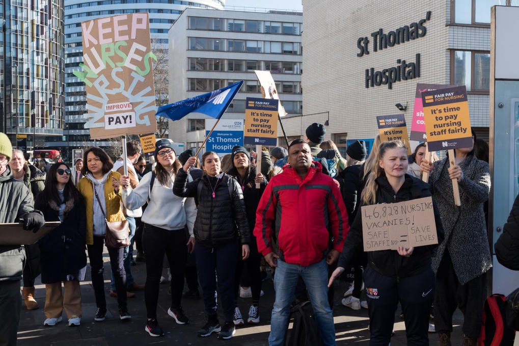 Các y tá và người ủng hộ họ tuần hành bên ngoài Bệnh viện St Thomas, London, Anh, hôm 6/2. Ảnh: AFP.