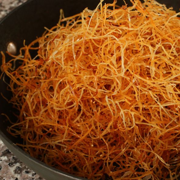 Bước 2: Cho các sợi miến khô vào trộn đều. Dùng thìa gỗ và kẹp gắp đảo đều trong vài phút đến khi miến chuyển sang màu hơi bóng và giòn.