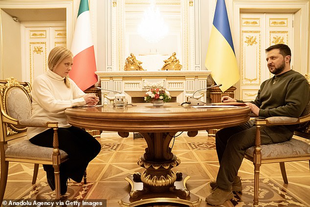 Trong ảnh, Tổng thống Ukraine Volodymyr Zelensky và nữ Thủ tướng Italia Giorgia Meloni nhìn thẳng vào nhau với vẻ mặt đầy cứng rắn, khi Italia từ chối cung cấp chiến đấu cơ cho Ukraine.