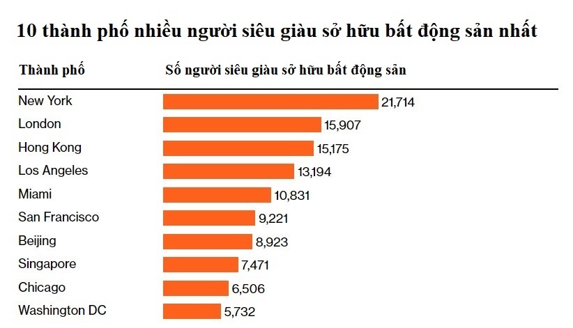 Những thành phố có đông giới siêu giàu mua bất động sản nhất. Hóa ra Mỹ thống trị danh sách 10 thành phố được nhiều người siêu giàu lựa chọn để mua bất động sản nhất, các vị trí còn lại thuộc về London, Hong Kong, Singapore và Bắc Kinh.