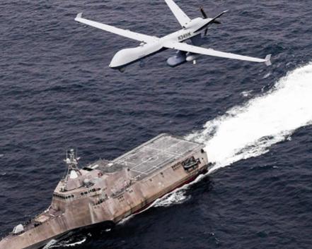 Một chiếc MQ-9 bay phía trên tàu USS Coronado của Mỹ. Ảnh: AP