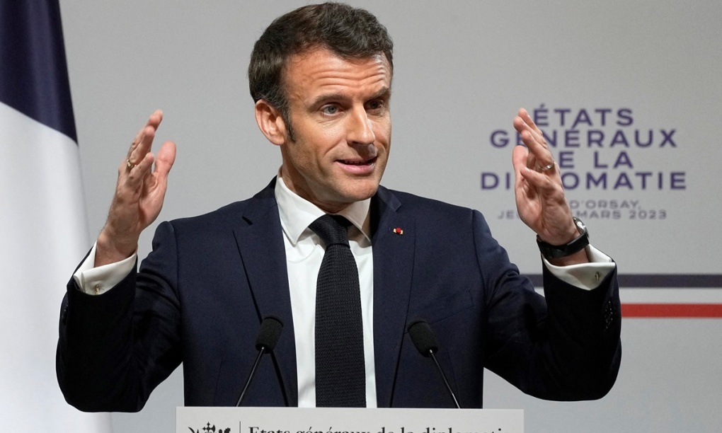 Tổng thống Pháp Emmanuel Macron phát biểu trong Hội nghị Bàn tṛn Quốc gia về Ngoại giao ở Paris hôm 16/3. Ảnh: Reuters