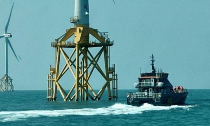 Một tàu chạy qua trang trại gió trên biển Đài Trung. Ảnh: Focus Taiwan.