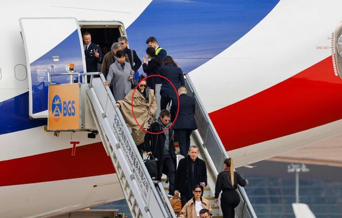 Hình ảnh Củng Lợi và chồng bước ra từ chuyên cơ của Tổng thống Pháp nhận được sự chú ý. Ảnh: Sina.